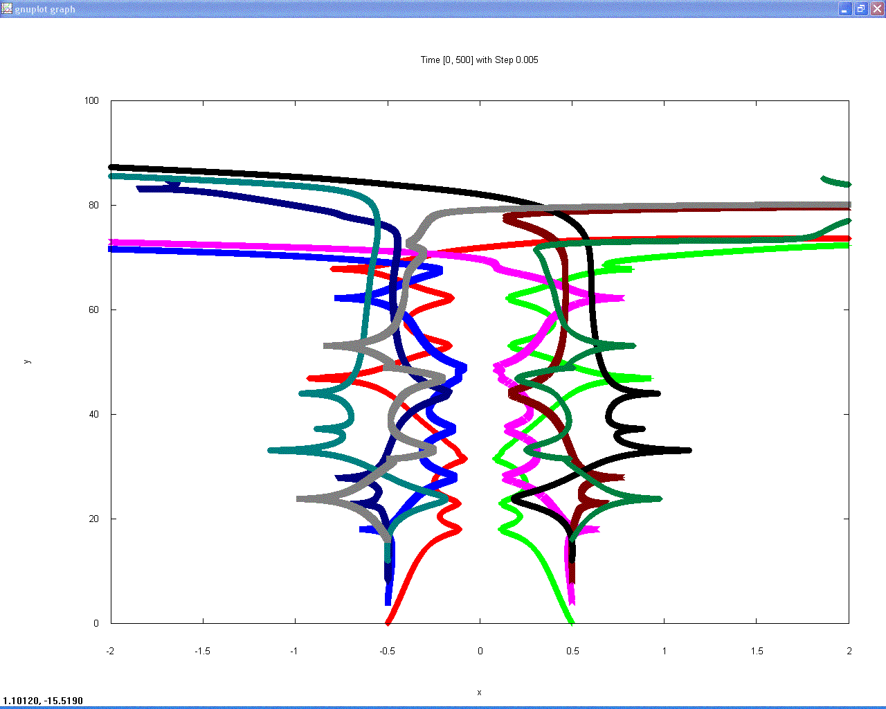 Thes are both plots of a herd of vortices moving through a fluid, both integrated with RK4 and the same time step. The left-hand plot used "floats" to store state variables, and the right-hand plot used "doubles."